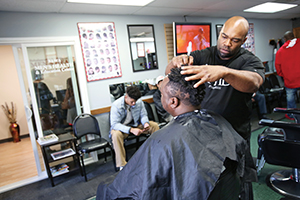 Spencer Johnson styles Jeremiah Edwards’ hair at JP Hair Design in Madison, Wisconsin. Edwards faces the entrance to the Men’s Health & Education Center, which opened inside the barbershop in 2016. The center is funded through grants from SSM Health. Amber Arnold/Wisconsin State Journal