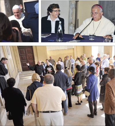 CHA's annual Ecclesiology and Spiritual Renewal Program for Health Care Leaders in Rome offers ministry executives and trustees the opportunity to understand more fully the views and teachings of the Catholic Church, and the impact on its global health care ministry. Here are some postcards from this year's program held April 27-May 2. Clockwise from top left: Participants get an up-close view of Pope Francis during a general papal audience in St. Peter's Square. Archbishop Joseph Augustine DiNoia, OP, the Undersecretary of the Congregation for the Doctrine of the Faith, lays out the thinking underlying a recent report from the Vatican on the principles governing cooperation between Catholic and non-Catholic organizations. He shares the dais with CHA President and Chief Executive Officer Sr. Carol Keehan, DC. Fr. Mícheál MacCraith, OFM, welcomes some of the 53 participants and their guests to a tour of Sant'Isidoro in Rome.