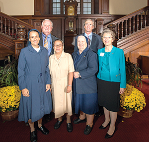 Pictured at the award ceremony are, front row, from left, Sr. Monica De Juan Sanchez, DC, director of the Rosalie Rendu Health Center in Port-au-Prince; Sr. Gloria Del Carmen Herrera Sixco, DC, director of the Lucelia Bontemps Health Center in Port-au-Prince; Sr. Bernice Coreil, DC, senior executive advisor to the president of St. Louis-based Ascension Health; and Sr. Joyce Meyer, PBVM, a Medicines for Humanity board member. In the back row, from left, are Timothy W. Bilodeau, founder and executive director of Medicines for Humanity, and Thomas M. O'Neill, a Medicines for Humanity board member and managing director/partner of Navigator Management Company.
