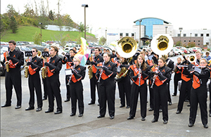 The marching band of Cincinnati's Anderson High School greets arrivals to the groundbreaking ceremony for Mercy Health – Anderson Hospital, one of two Mercy Health hospitals in Cincinnati that are expanding in order to address a gap in services in the community.
