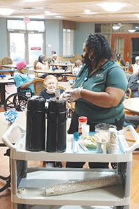 A staff member serves morning beverages to clients of the Program of All-Inclusive Care for the Elderly center in Baton Rouge in Louisiana.