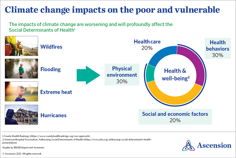 As we look at what lies ahead, we are convinced that care of God's creation is not only important; it is an urgent matter that demands immediate attention. When I think about my children and future generations, our employees and the patients and communities we serve, I realize how the work of environmental sustainability cannot wait. Wildfires and floods, hurricanes and extreme heat will increasingly affect our health — further compounded by social determinants impacting those who are poor and vulnerable.