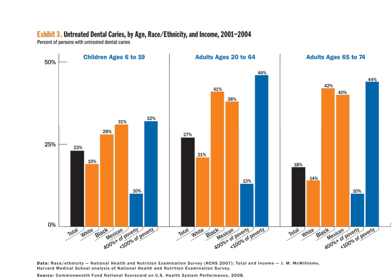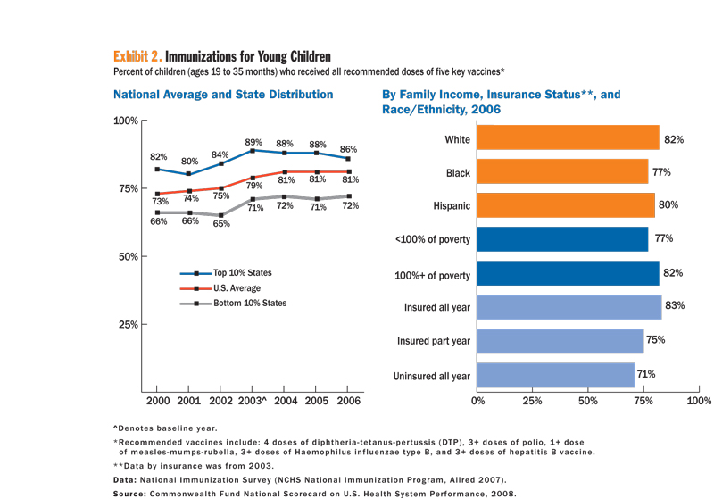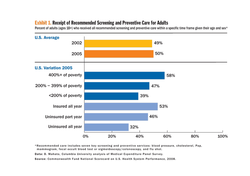Exhibit 1 shows that adults in the United States, as of 2005, received only 50 percent of the recommended screening and preventive care for their specific age group. Furthermore, persons who are poorer, uninsured or have unstable insurance coverage — the latter two groups include roughly 70 million Americans — are much less likely to receive the recommended care. Ideally, performance would be close to 100 percent since few contraindications to the particular recommended practices exist. Similarly, Exhibit 2 shows that one in five American children has not received preventive care as basic as a complete set of recommended childhood immunizations. Again, significant differences by insurance status and major differences in performance by state are evident. Furthermore, Exhibit 3 indicates that preventive dental care is less than optimal for Americans of all ages, particularly those who are non-white or poor.