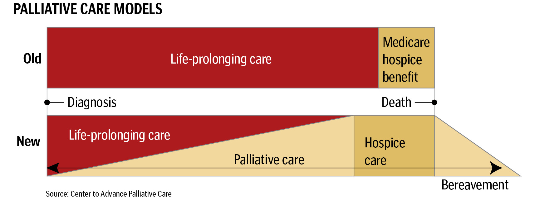 The diagram below contrasts the current standard of care with the palliative care approach.