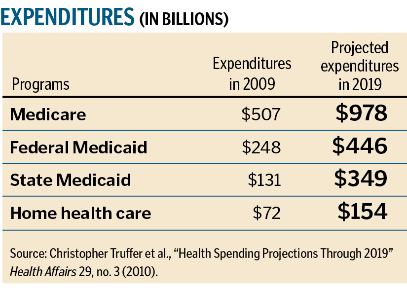 In 2009, Medicare expenditures were at $507 billion with projections to 2019 of $978 billion.3 Federal Medicaid expenditures were at $248 billion in 2009 with projections to 2019 of $446 billion.4 State Medicaid expenditures were at $131 billion in 2009 with projections to 2019 of $349 billion.5 Home health care in 2009 stood at $72 billion with projections to 2019 of $154 billion.6 Nursing home care in 2009 was at $144 billion with projections to 2019 of $246 billion.7