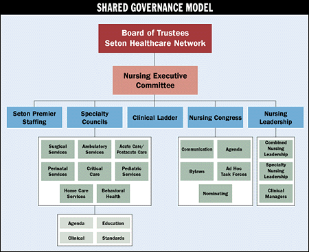 Early on, we began developing a shared nursing philosophy and a framework for what has become Seton's network nursing shared governance model. We knew that shared values, a consistent nursing philosophy and practices, and a uniform clinical ladder for the four Austin hospitals would be the keys to successfully integrating new sites. We believed that enhancing professional identity was the key to integrating care delivery. Professionals tend to align with the values, practices, and culture of their group rather than with the overall organization.