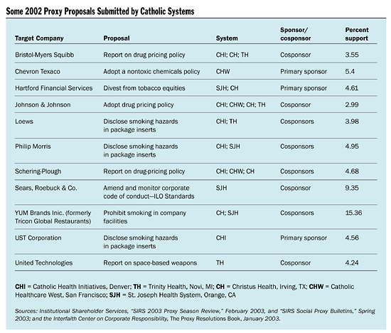 To begin the process of aligning their investments with their values, many Catholic health care systems have developed a set of proxy voting guidelines and simply voted their proxies. Once the proxy voting program is up and running, these organizations have begun to cosponsor resolutions filed by other health care systems or socially responsible investors and to participate in dialogue campaigns. Catholic health care organizations have justified their participation in shareholder advocacy objectives by stressing the importance of stewardship and the goal of improving public health. Colleen Scanlon, senior vice president for advocacy, Catholic Health Initiatives (CHI), Denver, notes: