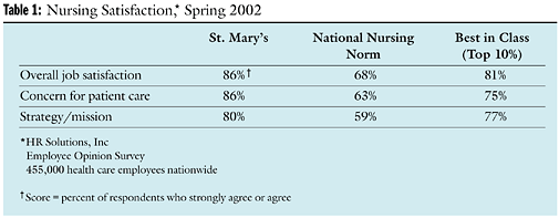 Experience has shown that it is only through satisfied employees that a health care facility can hope to have satisfied patients. Because this is so, St. Marys' Nursing Organization focuses on creating a satisfying practice environment in which nurses can feel good about their work. In a 2002 employee satisfaction survey, St. Marys' nurses scored higher than the survey's "best practice" (the top 10 percent of 455,000 health care employees in the selected vendor's data base) in three critical dimensions: overall job satisfaction, belief in the organization's concern for patient care, and belief in its strategy and mission (Table 1).
