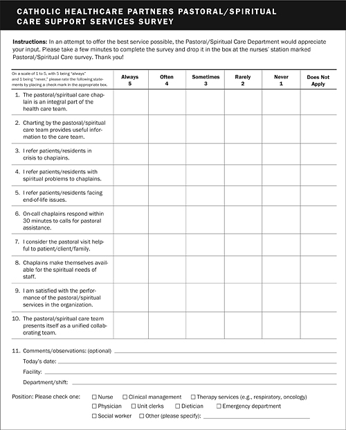 Like most other systems, CHP uses patient satisfaction scores to measure chaplains' effectiveness. The challenge involved in doing so — as identified by spiritual care directors across CHP and at other systems — is that much of chaplains' work is done with dying patients and their families, who, for obvious reasons, cannot be asked to fill out patient satisfaction surveys. In order to gather more evidence for use in outcome measurement, CHP developed a "Pastoral/Spiritual Support Services Survey" instrument and administered it to those who work with chaplains (including nurses, physicians, emergency departments, clinical management, and others) on a regular basis. Results of the surveys were overwhelmingly supportive of the chaplains' effectiveness as members of their respective health care teams.