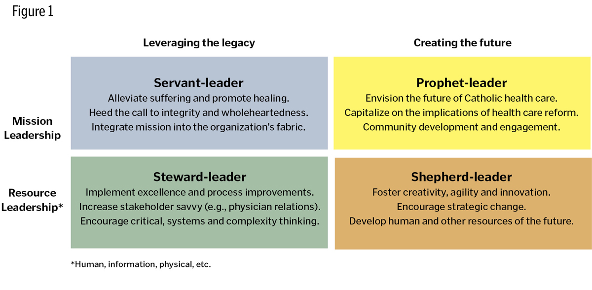 Prophet-Leader: This describes roles central to the evolution of the organization's healing mission. A prophet-leader envisions the future of Catholic health care, especially in light of the increasing reliance on lay leaders, recent health care reform in the United States, advancing health care technologies like genomics, non-embryonic stem cells, electronic medical records and other issues. Catholic health care leaders today have to navigate changes that were unimaginable just a few years ago, including mergers or alliances with non-Catholic organizations.