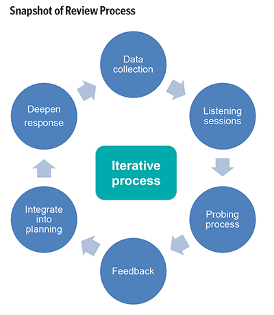 Follow-up: To deepen relationships at the local level, the review team talks with executive and middle management leaders about what has been learned within their operating units, engaging them in further dialogue and charging them to continue the listening sessions with their colleagues and caregivers around issues or concerns, visions and hopes identified during the review.