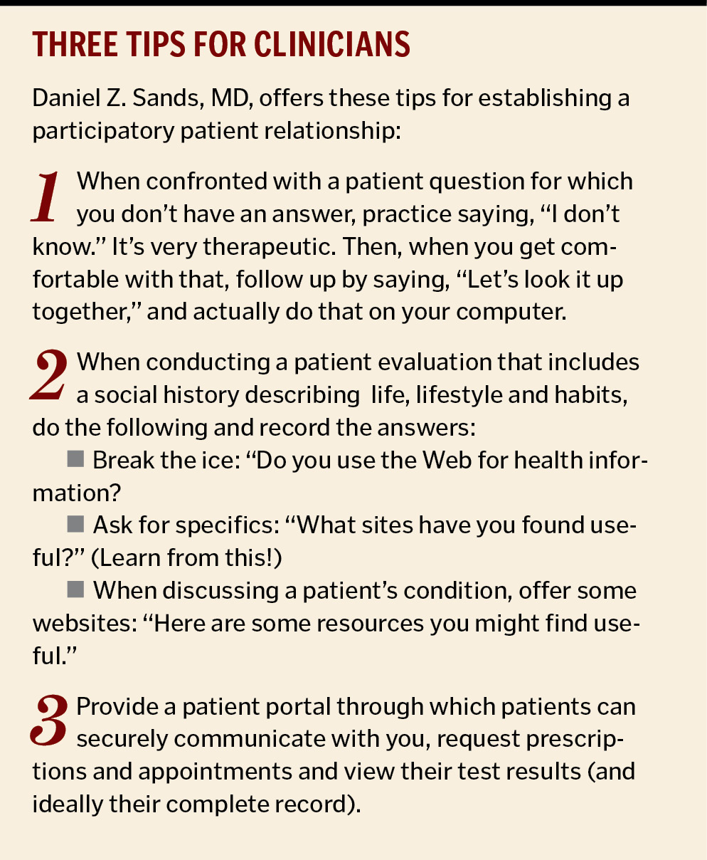 The foundation for participatory medicine is patients working closely with clinicians to become more knowledgeable about preventive care, as well as health maintenance and management of their own chronic conditions. They can then use this knowledge to make informed decisions in consultation with their physicians and other care providers. The process can also result in lower costs. This is, ideally, an ongoing relationship that depends on enhanced communication — often electronic — between patient and physician, "essential for reporting/discussing progress and/or problems with medications or other treatments," said Bertka. "It's also a good way to help patients realize that more medicine, more procedures and more expensive tests are not always the best solution."