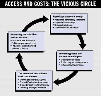 With regard to access, CHA urges the task force to withstand the pressure from some who argue that universal coverage should be postponed until budget savings are achieved. At best, this is a specious argument; at worst, it is a cynical one. The cost and access problems can only be solved concurrently because they are so interrelated (see Figure).
