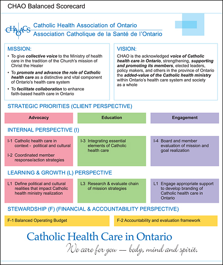 It was apparent that developing a strategy implementation system for CHAO's strategic priorities was essential to the realization of its mission and ensuring accountability to those whom we serve in the ministry of Catholic health care in Ontario. The Balanced Scorecard could offer CHAO three things:11