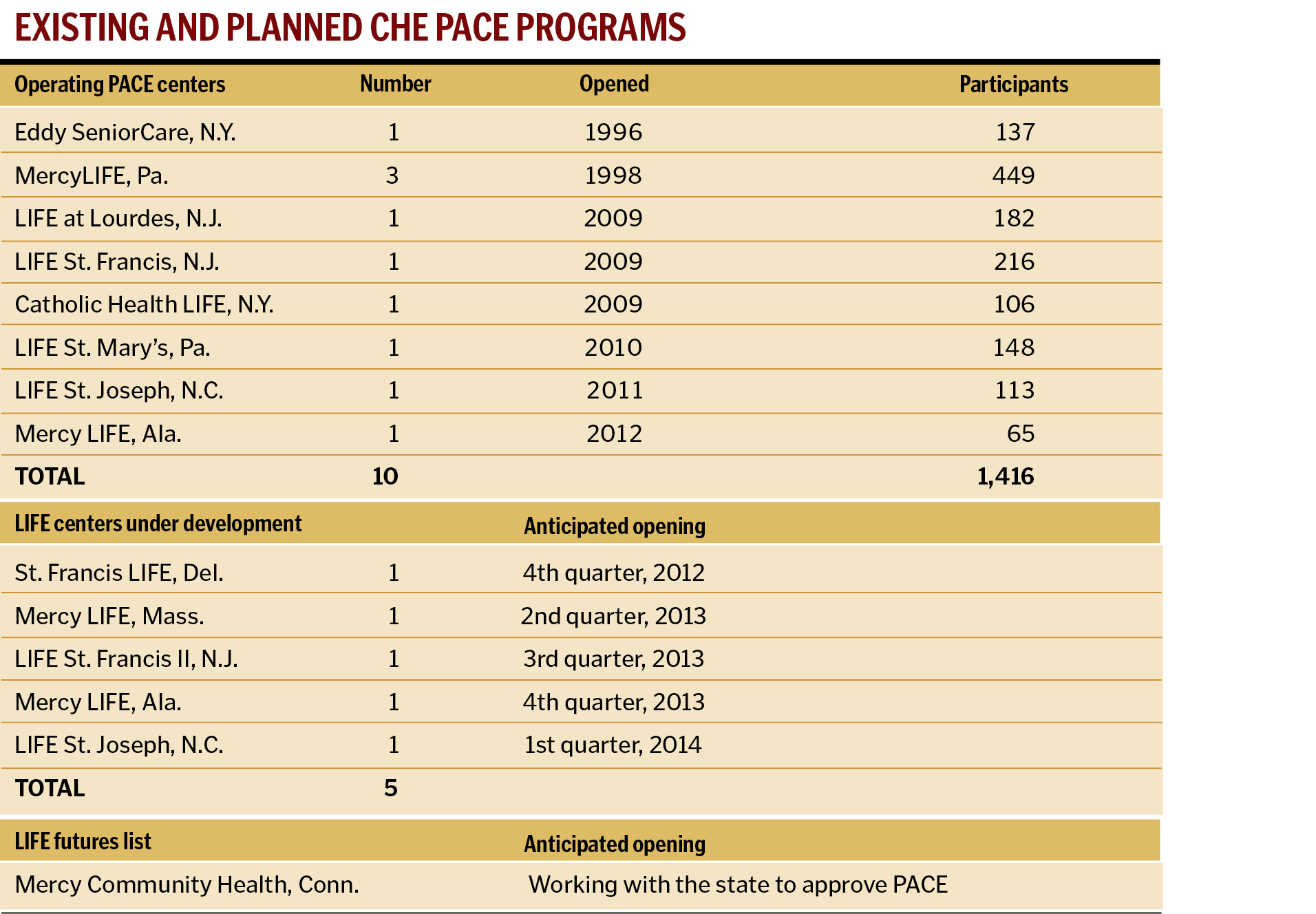 It wasn't until 2009 that three additional PACE programs were opened by CHE affiliates in New York and New Jersey: Catholic Health System, Buffalo, N.Y.; Lourdes Health System, Camden, N.J.; and St. Francis Medical Center, Trenton, N.J. The New Jersey-based programs reached capacity within two years, and are both engaged in identifying other locations for expansion.