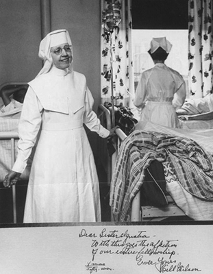 When Sr. Ignatia was in charge of patient admissions at St. Thomas Hospital in Akron, she saw firsthand the damage excessive drinking could cause. The hospital treated those injured in car and other accidents where a person had been intoxicated; Sr. Ignatia also spoke with patients' family members who detailed how compulsive drinkers both suffered and brought suffering into their homes. Sr. Ignatia worked closely with one physician, Dr. Robert H. Smith, who talked with her about the devastating effects of alcoholism. Both Sr. Ignatia and Dr. Bob wanted to aid those struggling with addiction and their loved ones.