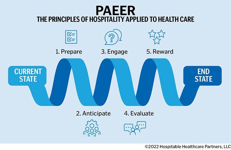 These five disciplines coalesce to form a transformational model of service delivery we call PAEER (for Prepare, Anticipate, Engage, Evaluate and Reward, as shown by the graph on this page, and pronounced "pay-er"). We recommend health care service providers adopt this framework to address "hospitality deficits" at each step of service delivery.